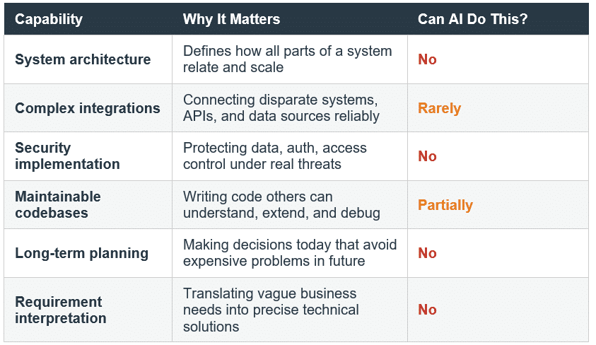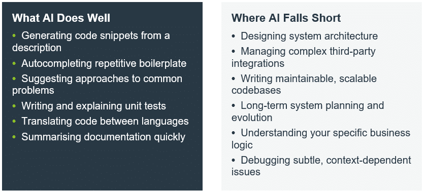 Here is our grounded view of what AI can and cannot do, and why skilled development teams are not going anywhere.