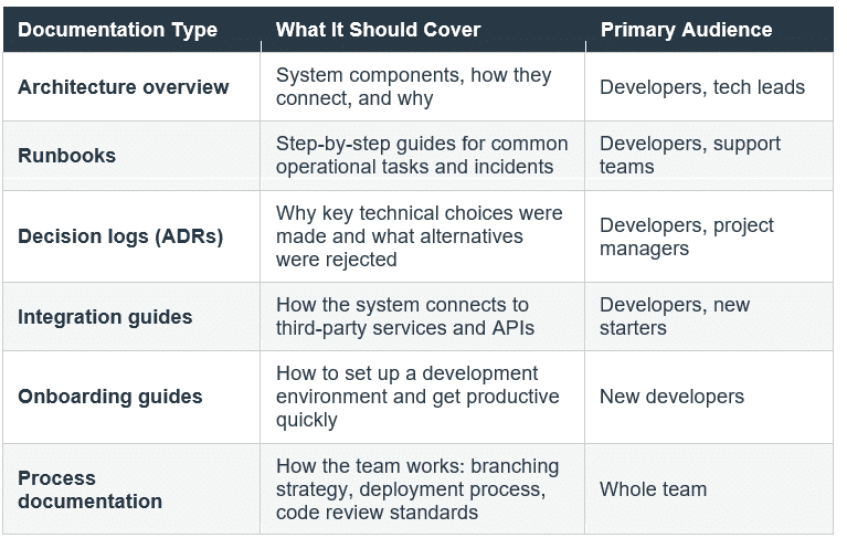Good internal documentation is not about writing everything. It is about capturing the things that are genuinely hard to reconstruct: why a particular architectural decision was made, how a complex integration works, what the non-obvious gotchas are in a given system, and where to start when something goes wrong.